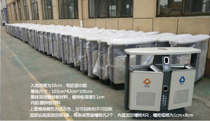 產(chǎn)品簡(jiǎn)介:整體尺寸:103cm*42cm*100cm;整體采用鍍鋅板材料,鍍鋅板厚度0.1cm,內膽為鍍鋅板材料;上蓋桶身顏色為淺灰色,分可回收和不可回收;底部設底座固定梁3條,每條梁預留螺栓孔2個(gè),內置固定螺栓4只,螺栓規格為1cm8cm(…